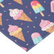 Pattern on blue background with creamy ice cream and popsicles, cherries and confetti floating around. Cute whimsical food design.