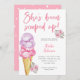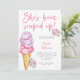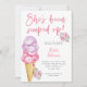 Fun ice cream themed bridal shower invitation. This template invite card features a pink and purple ice cream on a waffle cone painted with watercolor. The text above says "She's been scooped up!" Customize this card by adding your own shower information.
