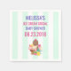 Paper napkins for an ice cream social event such as a baby shower or birthday. Illustrated with drawing of a 3 scoop ice cream sundae with colourful sprinkles. An ice cream cone with scoops of chocolate, strawberry and vanilla. A bowl of neopolitan ice cream with a cherry on top. Strawberries and a pineapple fruit sit beside the bowls. Summery and sweet. A mint green and white stripes pattern in the background.