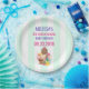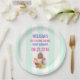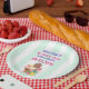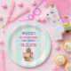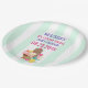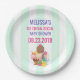 Paper plates for an ice cream social event such as a baby shower or birthday. Illustrated with drawing of a 3 scoop ice cream sundae with colourful sprinkles. An ice cream cone with scoops of chocolate, strawberry and vanilla. A bowl of neopolitan ice cream with a cherry on top. Strawberries and a pineapple fruit sit beside the bowls. Summery and sweet. A mint green and white stripes pattern in the background.