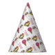 Party hat design features an original marker illustration of a delicious banana split, hot fudge sundae, ice cream cone, and strawberry shake.