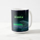 A peaceful moment in the long Arctic night. A Polar Bear rests at the edge of an open area in the pack ice.The Northern Lights glow in the distance; bright stars twinkle overhead. Text reading "Alaska" appears in glowing green and white. Polar bears are endangered. How much longer will scenes like this be able to occur? Please help save Polar Bears from extinction.
