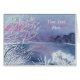 A watercolor landscape of a winter pond with surrounding foliage frosted with ice adorns this card. Customise by changing the text to suit yourself!