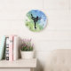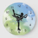 Ice Skater Design Wall Clock featuring the a pair of white ice skates against a blue and green starry background, with customizable text.