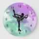 Ice Skater Design Wall Clock featuring the a pair of white ice skates against a turquoise and purple starry background, with customizable text.