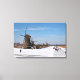 Canvas landscape print with people ice skating on the frozen river along several windmills on a beautiful winter day in Kinderdijk, the Netherlands.