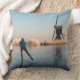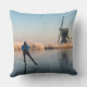 Photo throw pillow with an athlete ice skating on a frozen river past hoar-frosted reeds and a windmill on a beautiful winter morning in the Netherlands.