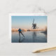 Postcard of an athlete ice skating on a frozen river past hoar-frosted reeds and a windmill on a beautiful winter morning in the Netherlands.
