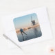 Photo sticker with an athlete ice skating on a frozen river past hoar-frosted reeds and a windmill on a beautiful winter morning in the Netherlands.