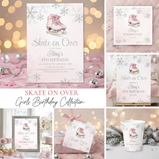 A beautiful ice-skating birthday invitation featuring soft pink tones, elegant silver glitter snowflakes, and watercolor ice skates. Perfect for winter birthdays and girls skating parties.
