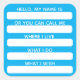 Conversation starter hello name tag for party or event with custom icebreaker info questions like: Hello my name is; or you can call me; where I live; what I do; what I wish tags with blanks boxes to fill in with serious or funny statements. The text can be edited as desired, and also the blue background color can be changed. Get the discussions rolling! Matte finish is easier for writing in answers in the white boxes.