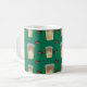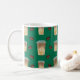 This pattern features iced caramel macchiato cups and coffee beans on a green background.
