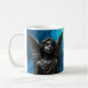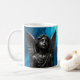 A sleek black-metal angel with reflective wings and vivid blue eyes stands before an aqua-teal, ice-textured backdrop, creating crisp contrast and a cool, ethereal mood. Perfect for fantasy art fans, gothic décor lovers, and modern spaces seeking a striking statement on mugs, wall art, and apparel.