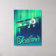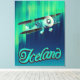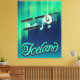 Iceland vintage style Travel poster of the Northern lights and a light aircraft flying past.