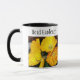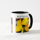 A white ringer mug with black rim and handle and a photographic image of golden Iceland Poppies, front and back. The words, 'Head Gardener', in black, are just below the rim.