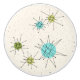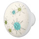 This Iconic Atomic Starbursts Ceramic Pull pattern features iconic atomic starbursts. That’s right! The old school, cream coloured background with gold speckles is the perfect backdrop for the vibrant turquoise, soothing celery, and kitschy pear green coloured circles. The spots of colour are sporadically placed in various sizes with overlaying black V shaped lines to form the mod sputnik starbursts. Styled after a 1950’s dish pattern, this retro inspired design has everything you need to be truly mid century modern.