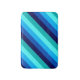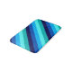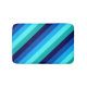 A small sized bath mat featuring a cool pattern design of diagonal stripes in navy blue, cobalt blue, sky blue, icy mint teal, and light turquoise.