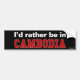 I'd Rather Be In Cambodia! Are you from Cambodia? Do you have a friend or family member who loves Cambodia? If so, this "I'd Rather Be In..." bumper sticker is what you're looking for! The design features "I'd rather be in" in small white lettering at the top and "Cambodia" in big red lettering at the bottom.