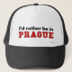 I'd Rather Be In Prague! Are you from Prague, Czech Republic? Do you have a friend or family member who loves Prague, Czech Republic? If so, this "I'd Rather Be In..." hat is what you're looking for! The design features "I'd rather be in" in small black lettering at the top and "Prague" in big red lettering at the bottom.