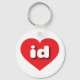 This key chain features a vibrant red heart containing the bold, white, rounded lower case letters id, a playful abbreviation for the state of Idaho, the gem state.
