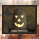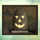 Potatoes substitute for pumpkins as Jack O'lanterns in Idaho. A potato, carved and lit in the manner of a Halloween pumpkin, sits atop a pile of spuds, set against a burlap sack. Customisable text reading, "Happy Halloween" also appears. You may change both the font and text colour.