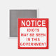 This fun notice is just the thing for your fridge. Available on other products this fridge magnet is in the form of a sign and reads: NOTICE, IDIOTS MAY BE SEEN IN THIS GOVERNMENT. - A funny political sign stating the obvious! Great to send to the Prime Minster and other politicians. I'm sure they would chuckle! lol.
