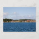 Swedish coast landscape with blue water and sky and red cottages and a boat. Photography.