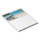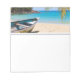 A notepad with an idyllic tropical beach scene. Turquoise blue crystal clear water and a soft brown sandy beach. Some palm leaves hanging down from above. An old wooden rowboat sits on the beach. A serene and peaceful landscape.