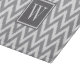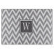Grey chevron glass cutting board with white monogram.