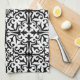 Digital reproduction of a damask medallion pattern with a striated, Ikat woven texture - White on a black background