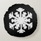 A delicate, lacy snowflake pattern on a solid background with a striated, Ikat woven texture - white snowflakes on a black background round pillow