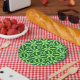 Digital reproduction of a stylised, four-point star pattern with a striated, Ikat woven texture - Dark pine or forest green with soft mint green