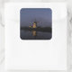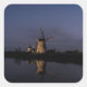 Souvenir photo sticker with illuminated historic windmills with reflection in the water of the river during the Blue Hour at the beginning of the night in Kinderdijk in the Netherlands.