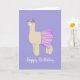 illusima Ballerina Llama purple girls Birthday Card designed by Melanie Jensen. This cute girl's birthday card can also be customised to be a girl's Baby Shower Card. The text "Happy Birthday" can be changed to "CONGRATULATIONS".