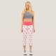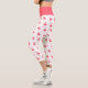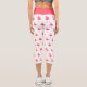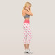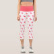 A pair of pink flamingo patterned capri leggings. The pattern shows illustrated flamingos on a white background. The leggings have a pink waistband that matches with a colour in the flamingoes.