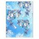 Playful illustrated watercolor white moon-lowers with birds & blue-green leaves on a blue flowering background.