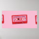 Illustration of a red plastic audio cassette tape, with a pink label that reads "Self-love" mixtape, heart and flower stickers on it. Old technology, realistic retro design, art image drawing.