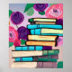Stack of books, pretty colourful pink and purple flowers digital art. Generativeart