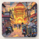 Cartoon ai illustration of downtown area of Kolkata, the capital and largest city of the Indian state of West Bengal. A coaster saying hi from India with an illustration of busy downtown street with buildings, restaurants, shops and people on their motor bikes.