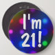 A festive colourful button pin with a background bokeh of colourful party lights and the text says: "I'm 21!" Easy to customise this cute badge and personalise with any age or name, etc. A happy and fun button pin for any age!