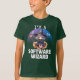 This image features a cartoon witch with a purple hat and a black dress, sitting on a pile of leaves and holding a broom. She has long, light blue hair and large, brown eyes. The background is a semi-transparent purple and blue gradient with a pattern of binary code. The text "I'M A SOFTWARE WIZARD" appears below the witch. The image suggests a playful and humourous take on the idea of a software developer as a magical figure. The binary code background further reinforces this connection to the digital world. The overall aesthetic is whimsical and fun, with a touch of whimsy.