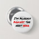 The design reads: I'm already against the next war with the words against and war in bright red. Behind the words is a large peace sign.