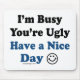 I'm Busy You're Ugly Have a Nice Day. Popular funny saying T-Shirts and Shirts. We also have this funny sarcastic insult on many products.