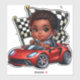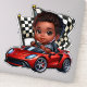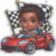 This adorable African-American toddler is ready to win the big race in his red sports car.