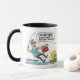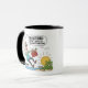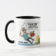 A black ceramic coffee mug with humorous white text that reads "I'm Retired I Don't Want To" with retirement jokes.