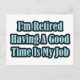 Cute, funny saying quote text design in blue and black that features the humourous retirement saying, I'm Retired, Having A Good Time Is My Job.