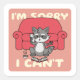 Express yourself with our adorable 'I'm Sorry, I Can't' cat sticker! This whimsical design features a charming cat character adorned with a playful expression, perfect for adding a touch of humour to any surface.Whether you're a cat lover looking to showcase your feline affinity or simply want to inject a dose of fun into your everyday life, this sticker is sure to delight. Stick it on your laptop, water bottle, notebook, or anywhere else that needs a bit of personality.Made from high-quality vinyl, our stickers are durable, waterproof, and easy to apply, ensuring they'll withstand the test of time. Plus, the vibrant colours and crisp design ensure that this sticker will stand out wherever you place it.So why wait? Grab our 'I'm Sorry, I Can't' cat sticker today and let your playful side shine!"