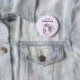 Button with an elegant watercolor illustration featuring a watercolor mom and baby unicorn with purple mane and forelock. Delicate orange flower blossoms surround the pair.