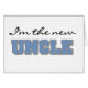 I'm the New Uncle T-shirts, hoodies, cards, baby announcement buttons, magnets, keychains, and other proud new uncle items with black and blue text.