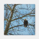 A photograph of a Bald Eagle perched in a tree, with a stern look, watching what is happening below the tree branches.